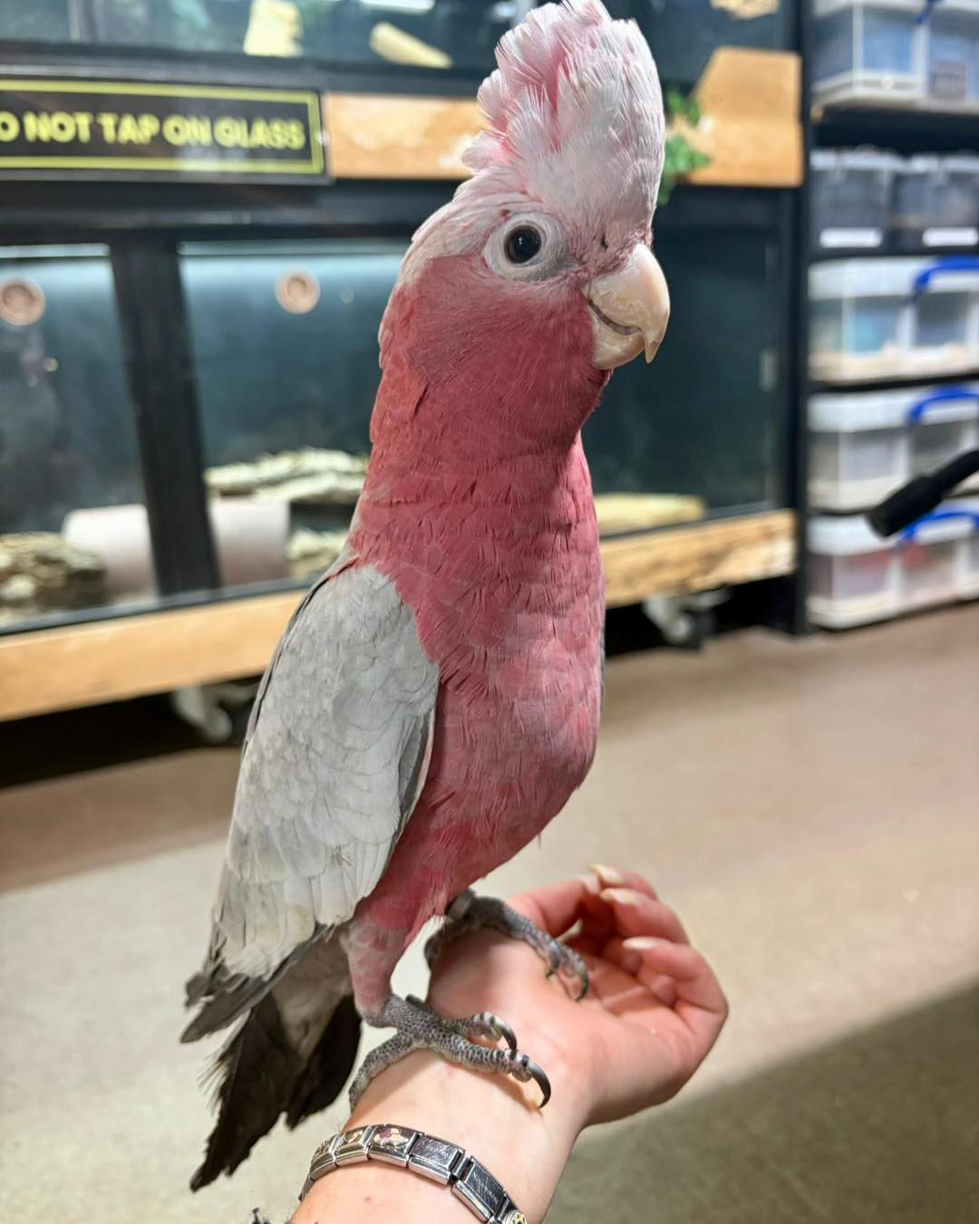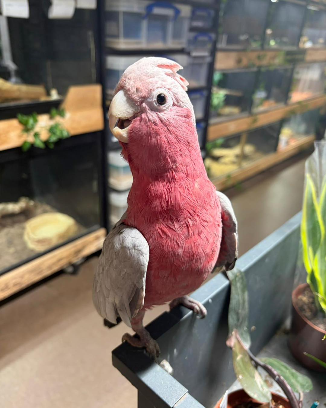 Meet Ringo, a beautiful Galah Cockatoo (Rose-Breasted Cockatoo) known for his stunning pink and grey feathers and his loving, playful personality. Ringo is a charming and intelligent bird, perfect for anyone seeking a social and affectionate feathered friend.