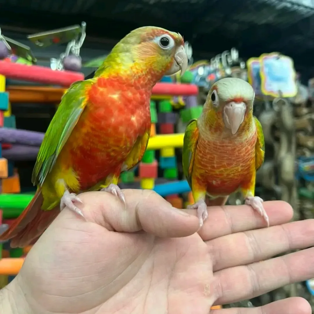 Meet this stunning pair of Pineapple Green-Cheek Conures, admired for their unique blend of bright yellows, reds, and greens. These small parrots are full of personality—playful, affectionate, and perfect for anyone looking for lively, colorful companions.